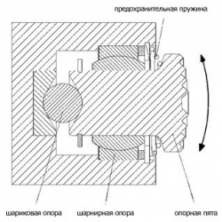 Kолодка закреплена на шариковой опоре и представляет собой подвижный подпятник. Захват закрепляется ручным усилием на поднимаемом материале. При тяговом усилии подпятник смещается и ”заклинивает” материал в захвате.